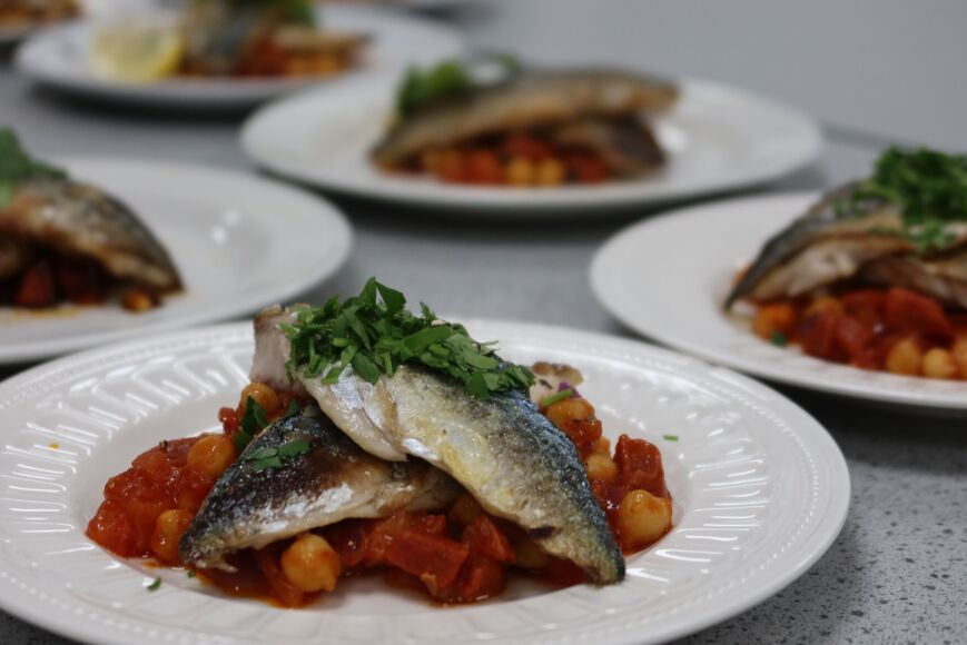 In the masterclass led by Simon Gray from the Food Teachers Centre, the student chefs looked at different species of fish, molluscs and crustaceans, learning about their nutritional value, as well as methods for sustainable fishing and the importance of the MSC certified label. Simon Gray demonstrated fish preparation and made a range of dishes for the students to taste test, including Thai green mussels, calamari, and a fish goujon sandwich. He used his extensive knowledge to discuss with the Year 10 students how to access the higher-level marks at GCSE when building dishes with fish. In the second half of the session, the students were given whole fresh mackerel, which they gutted and filleted to create delicious bowls of pan-fried mackerel with a chorizo and chickpea stew.