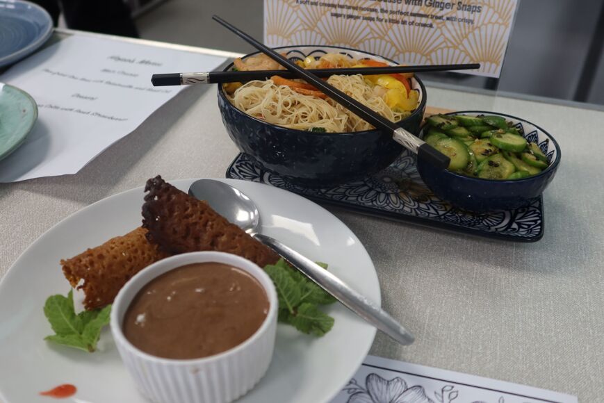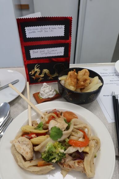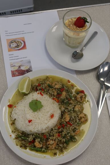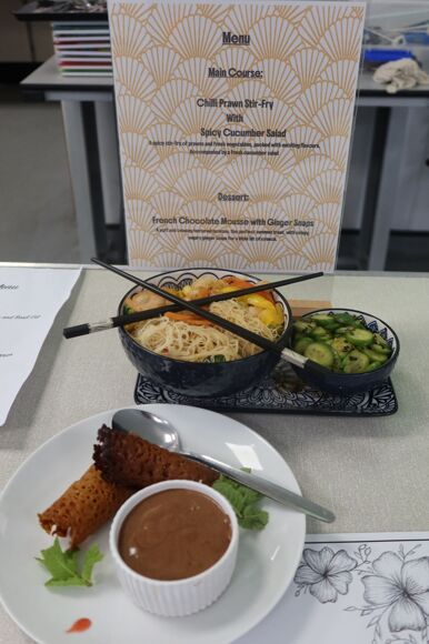 First prize went to Josh in Year 9 who wowed the panel with his beautifully presented chilli prawn stir fry with spicy cucumber salad, followed by a French chocolate mousse with ginger snaps.